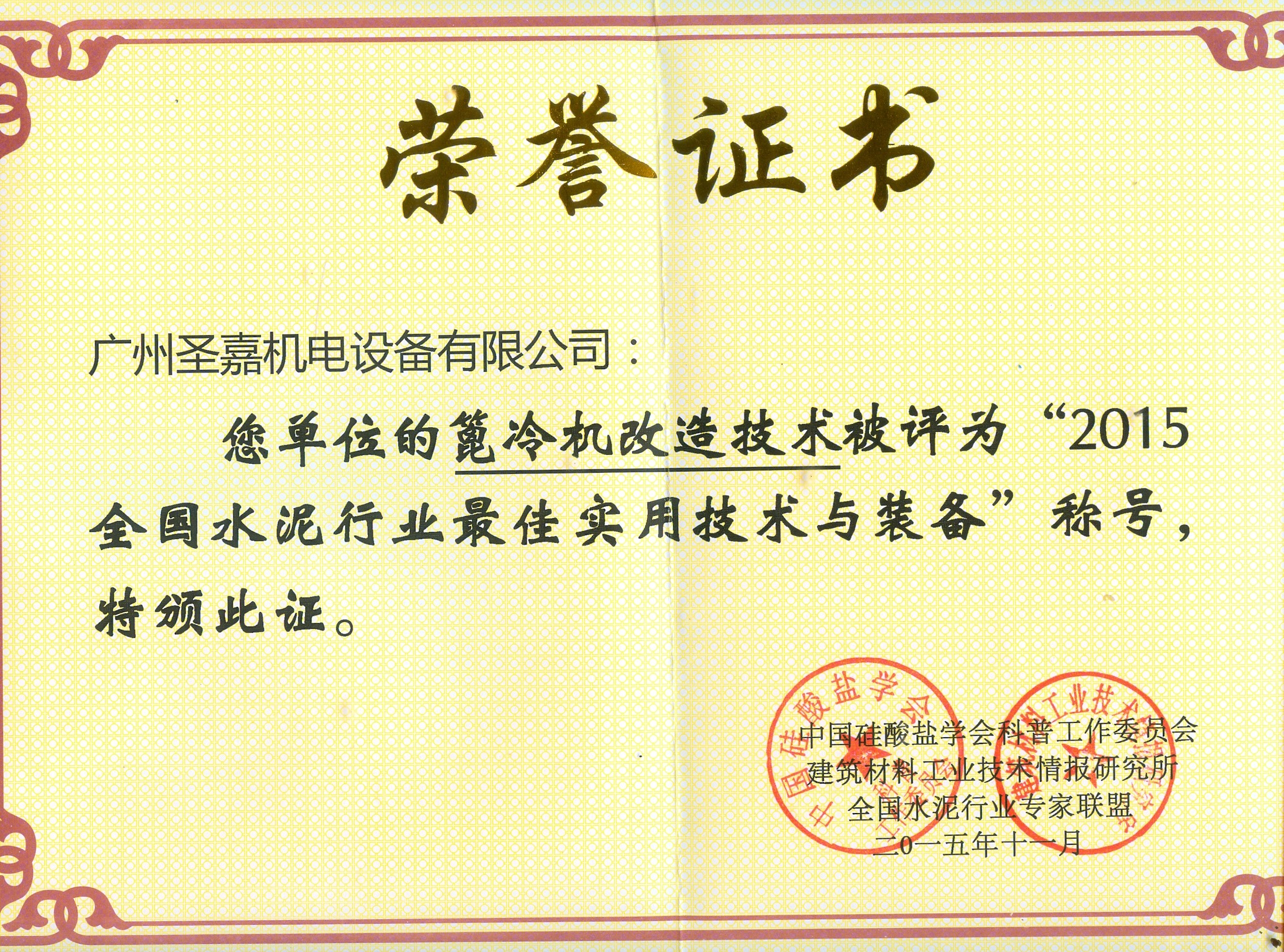 廣州圣嘉機電設備有限公司的篦冷機改造技術(shù)在由中國硅酸鹽學會科普工作委員會、建筑材料工業(yè)技術(shù)情報研究所、全國水泥行業(yè)專家聯(lián)盟舉辦的2015年“中國水泥技術(shù)年會暨全國水泥技術(shù)交流大會”上榮獲全國水泥工業(yè)最佳實用技術(shù)(BAT),獲得獎牌并在中國建材報上公示,同時入選收錄在由謝克平教授編寫的“高性價比水泥裝備動態(tài)集錦”一書中。